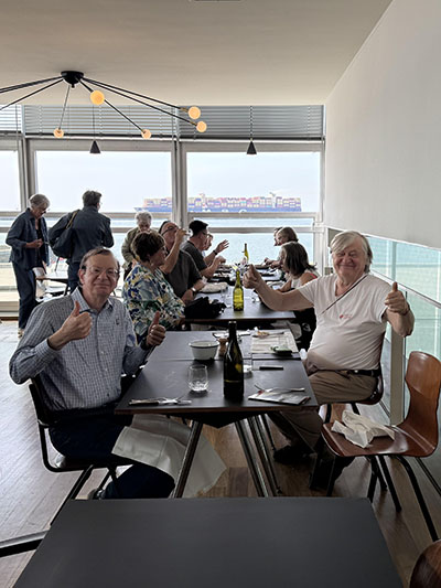 | Paul and Pierre having lunch in Les Fauves, the dining room of MuMa. Note the real container ship outside the window. | Pierre and Paul in Les Halles Centrales, the food hall nearby. | |