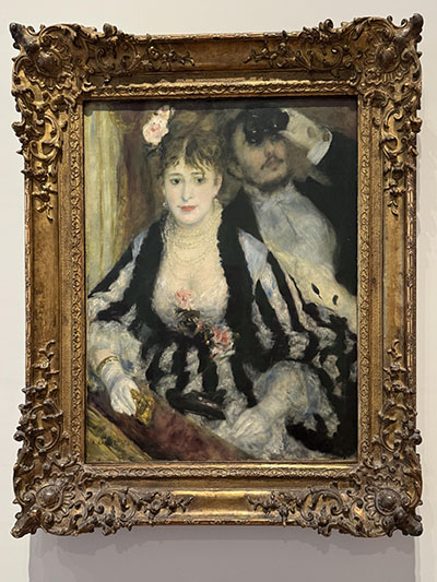 | La Loge (The Theatre Box) by Pierre-Auguste Renoir, 1874, depicts a young couple in a Paris theatre. Going to the theatre in 19th century France was as much about being seen as watching the performance. While the woman is making her presence obvious, her companion is scanning the audience through his opera glasses. |
