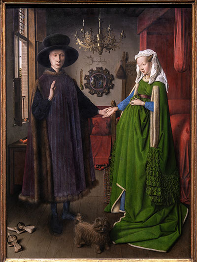 The Arnolfini Portrait by Jan van Eyck, 1434, shows a richly-dressed couple in a private room with objects chosen to proclaim their wealth and social status without risking criticism for aping the aristocracy. The man’s hand is raised in greeting. On the back wall, a large convex mirror reflects two men entering the room, one of whom also raises his hand. |