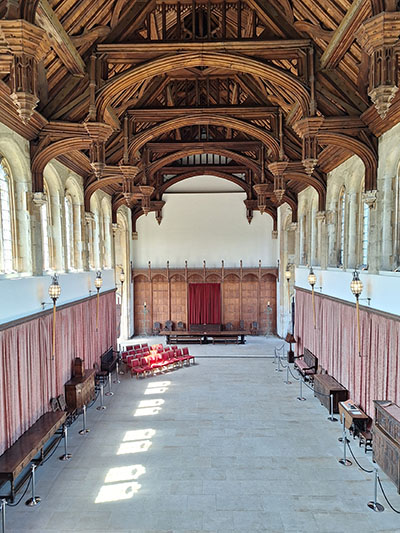 | The Great Hall was added by Henry VIII. The immense timber hammerbeam roof was built by royal shipwrights and designed to be strong without columns—like a warship. There are carved H's & A's (Henry & Anne) and the falcon badge of Anne Boleyn—reminders of her 3 years as Queen. (It is also believed that some of Shakespeare's plays were first performed here.) | Paul got horny! | ![]() |
