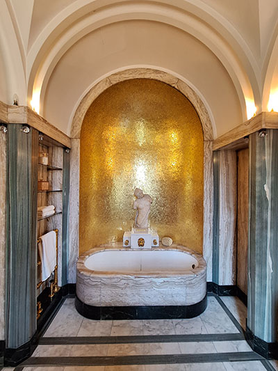 | Virginia Courtauld’s vaulted Art Deco bathroom, lined with gold mosaic and onyx has gold-plated bath taps and a statue of the goddess Psyche. | The Great Hall was built in the 1470s for Edward IV for dining, entertaining and receptions. The Courtaulds had a minstrels’ gallery added at one end so they could use it as a music room. | |||