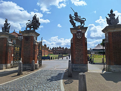 | Hampton Court Palace is on the River Thames upstream of central London. | Its Trophy Gate features sculptures depicting the Lion of England, the Unicorn of Scotland and Trophies of Arms. | |||