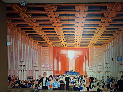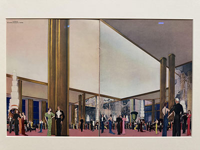 | Promotional drawing of Normandie First Class dining room. | Brochure from Compagnie Générale Transatlantique | |