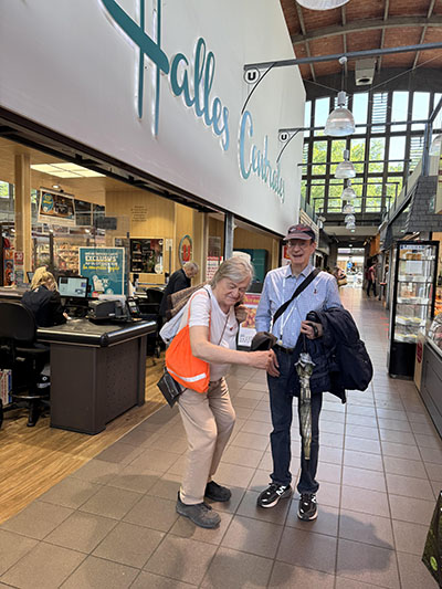 | Paul and Pierre having lunch in Les Fauves, the dining room of MuMa. Note the real container ship outside the window. | Pierre and Paul in Les Halles Centrales, the food hall nearby. | |