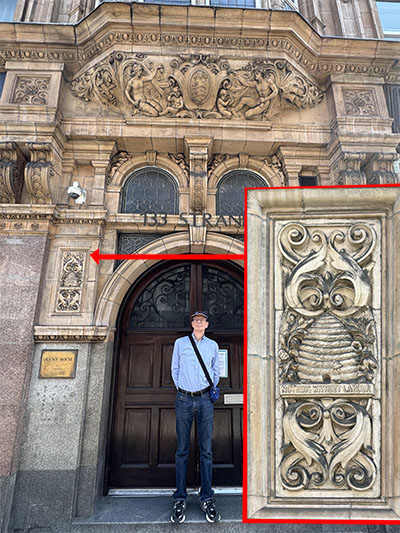 Duchy House on the Strand is a 19th century building used as a dorm for Courtauld Institute students. The insignia (which I enlarged on the right) is a beehive and motto, Nothing Without Labour. We wonder if that refers to the Labour Party!