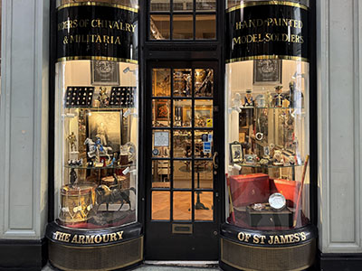 Also in the Piccadilly Arcade, The Armoury of St. James's deals in ceremonial and royal presentation items and historic objects.   Emmett London outside on Jermyn Street displayed shirts with a 1960's "Flower Power" look.