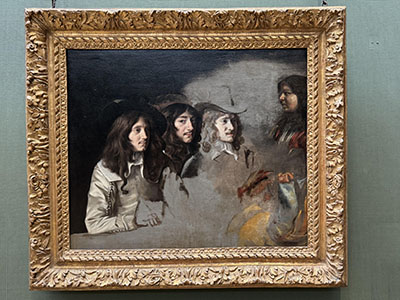 Intriguing! Three Men and a Boy, probably by the French Le Nain Brothers before 1648—the year Louis and Antoine died. Their deaths may explain why the painting is unfinished. (The picture reveals part of an earlier composition—the head of a boy on the right and blue and yellow drapery.) |