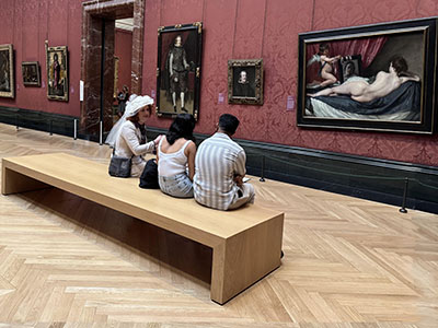 | La Loge (The Theatre Box) by Pierre-Auguste Renoir, 1874, depicts a young couple in a Paris theatre. Going to the theatre in 19th century France was as much about being seen as watching the performance. While the woman is making her presence obvious, her companion is scanning the audience through his opera glasses. |