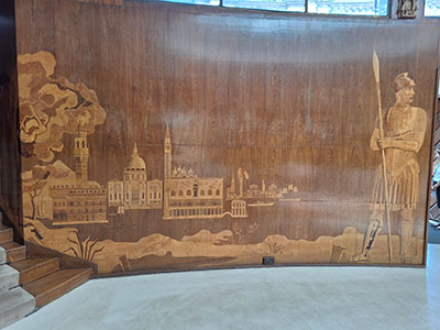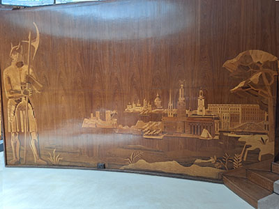 | The entrance hall has marquetry panels with motifs depicting a Viking and Roman soldier with Florentine and Venetian palaces, 1920s Stockholm architecture and the Courtaulds' prized motor yacht, Virginia. |