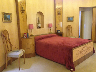 | The Art Deco dining room has an aluminium-leaf ceiling. The dining table and chairs are replicas, made in 1998 after the originals were rediscovered in 2001 at Pinewood Studios. | Many of the bedrooms reflect the Cunard style made popular by the fashionable cruise liners of the time, featuring built-in furniture and smooth veneered surfaces, often with curved ends. | |||