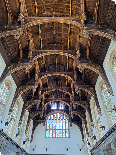 | The Great Hall was added by Henry VIII. The immense timber hammerbeam roof was built by royal shipwrights and designed to be strong without columns—like a warship. There are carved H's & A's (Henry & Anne) and the falcon badge of Anne Boleyn—reminders of her 3 years as Queen. (It is also believed that some of Shakespeare's plays were first performed here.) | Paul got horny! | ![]() |