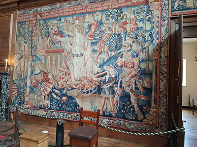 | The Labours of Hercules is a Brussels tapestry from the 1540s, in the King's Presence Chamber—a grand room which served as official throne room where the monarch held audiences, received guests and conducted formal state business. | The Abraham tapestries are a set of 10 Brussels tapestries from 1543, depicting stories about the biblical prophet Abraham, hanging in what was probably the original intended location, the Great Hall. | |||