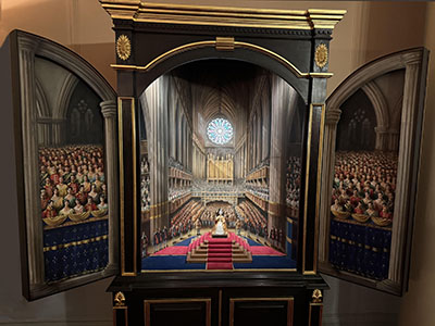 | Kensington Palace has been a royal residence for the British royal family since the 17th century. It's currently home to the Prince and Princess of Wales, the Duke and Duchess of Gloucester, the Duke of Kent, Prince and Princess Michael of Kent and Princess Eugenie and her husband Jack Brooksbank. (Can you imagine living with so many relatives?!) | Diorama of 19-year-old Queen Victoria's coronation on June 28, 1838 in Westminster Abbey, which sounded like a disaster! The ceremony took 5 hours without rehearsals. The coronation ring was forced on her wrong finger. An elderly peer fell down the steps while making his homage to the Queen. And a confused bishop wrongly told her the ceremony was over so she had to return to finish the service. | |||